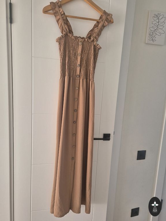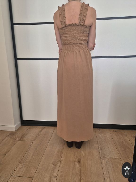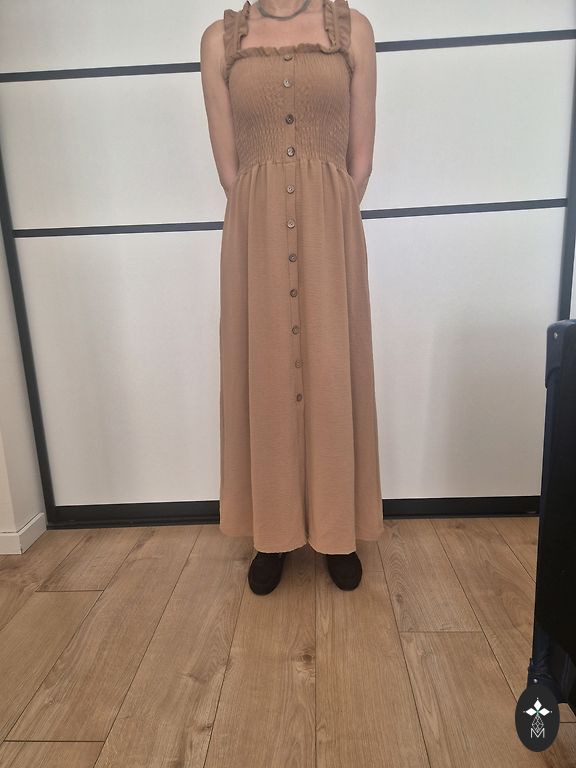 Jauna kleita, bez oderes, audumus poliesters, bet ļoti patīkams. Garums 101 cm. Foto uz auguma nav. XL, uz 42-44 izm. līdz 172 cm augumam, lai jostas vieta būtu vietā