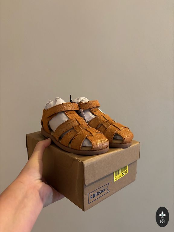 Lightweight, flexible, breathable, cork inner sole. Width adjustable in two places. Perfect clips. Bought new, worn for 2 months in kindergarten. Minimal scuffing, only a visual imperfection, visible in the last 2 photos. Inner sole 16 cm.
