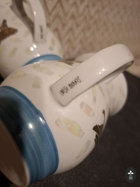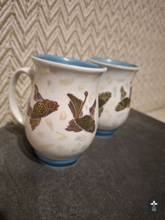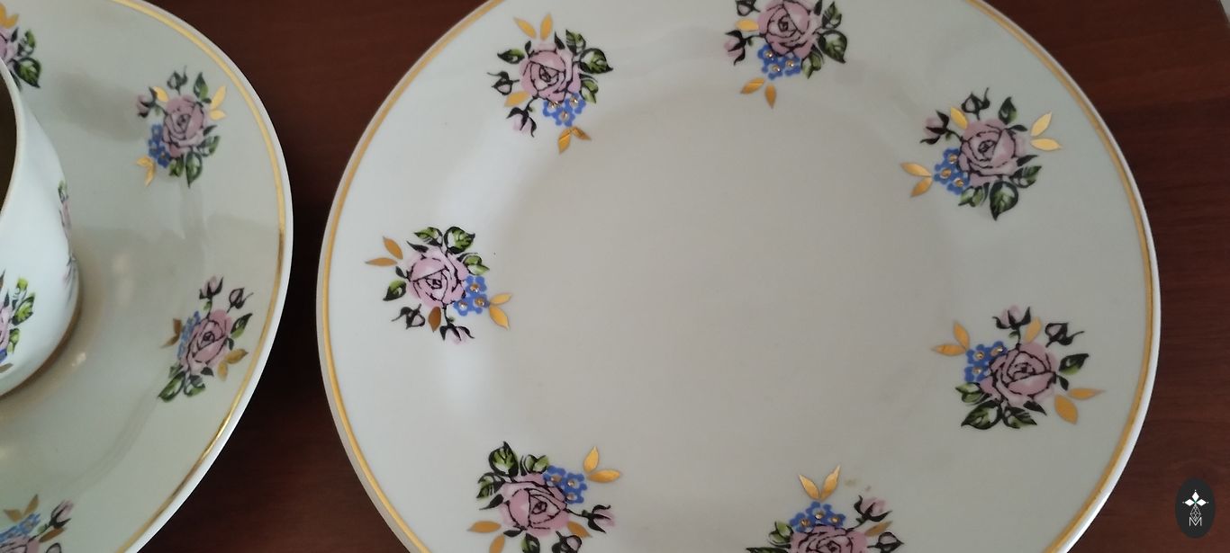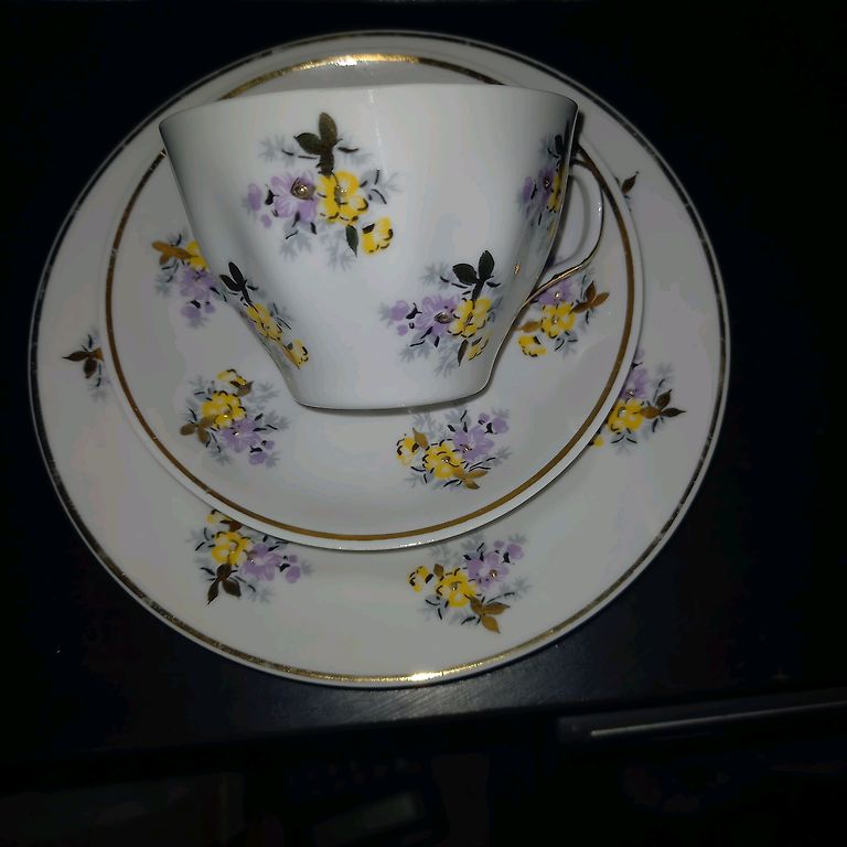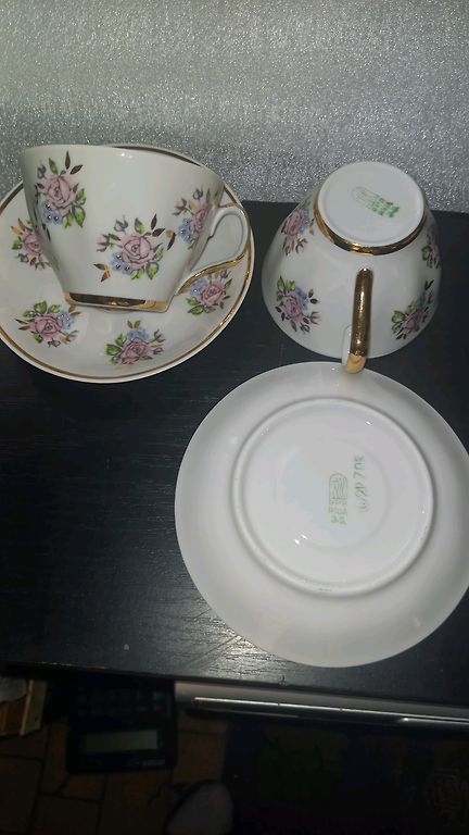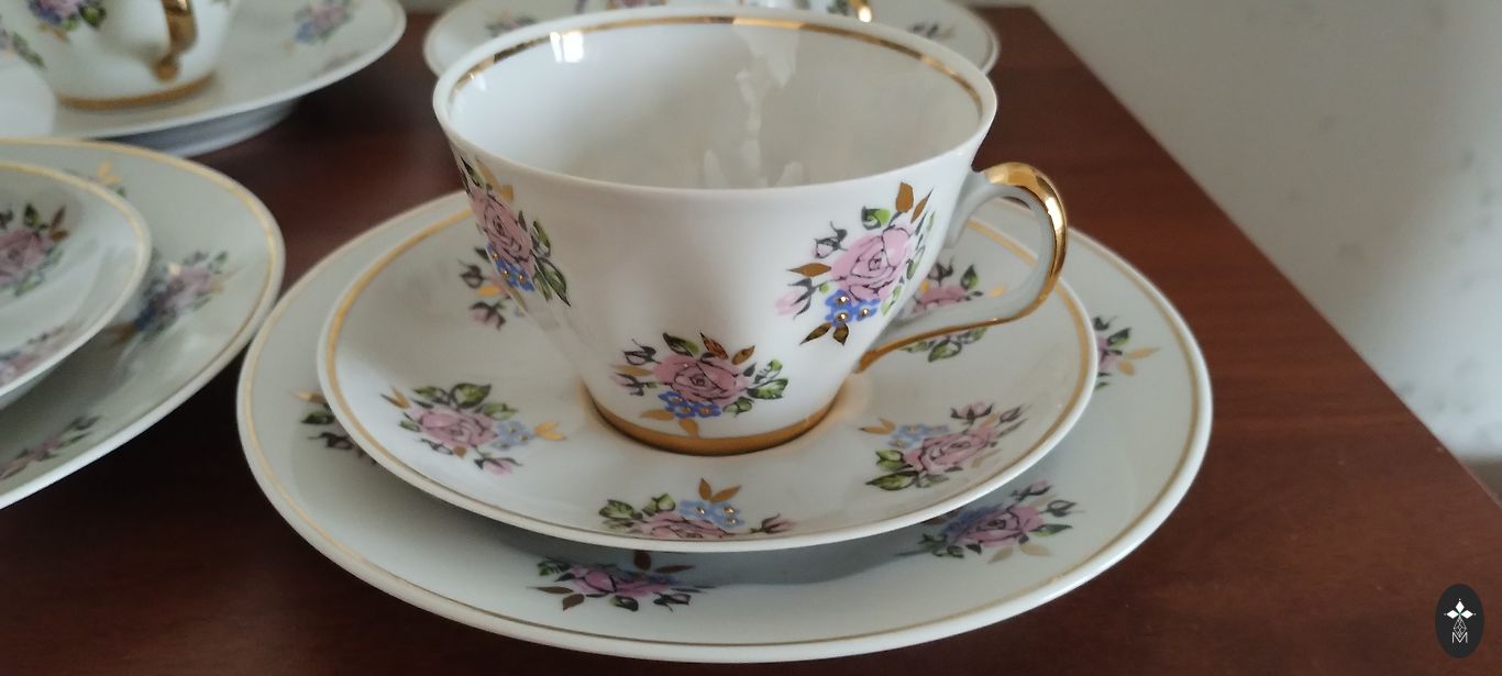 Kafijas servīzes SIGULDA TRIO + 1 deserta šķīvis ar zaļajiem zīmogiem. Krūzītei uz osiņas neliels zelta nodilums, vienam no deserta šķīvjiem mazi rūpnīcas pleķīši, foto ir apskatāms. Saņemšanas iespējas ir Rīga, pierīga, Salaspils un Baloži. Kurjera pakalpojumus apmaksā pircējs.