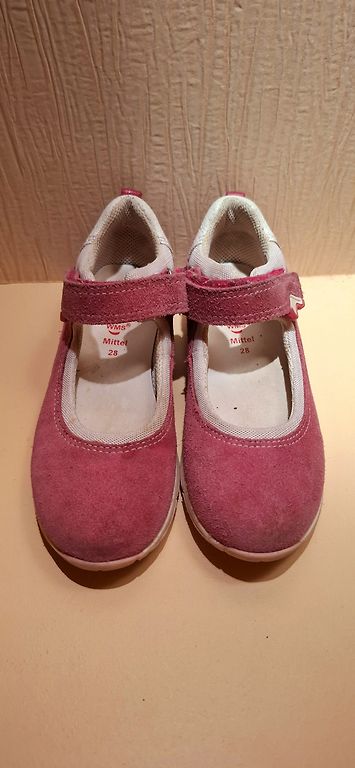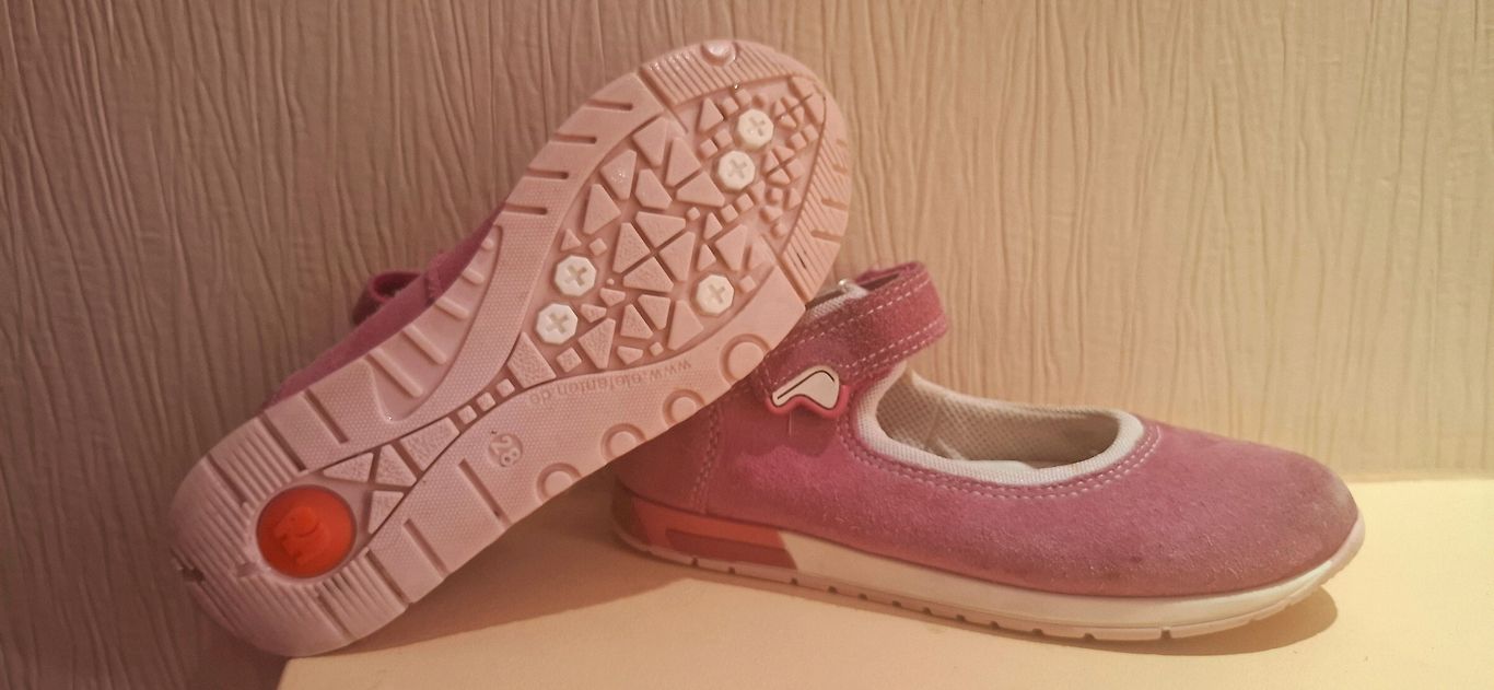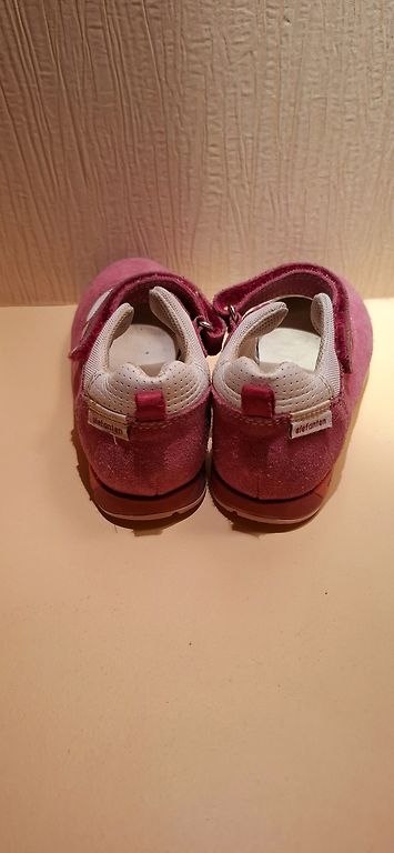Sneakers from a sports brand are made of faux leather and feature three stripes. Details: Adjustable lace-up closure, textile inner lining, lightweight and flexible sole, soft model. Like new, size 21, 14 cm.