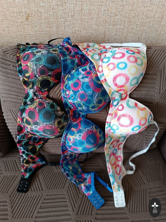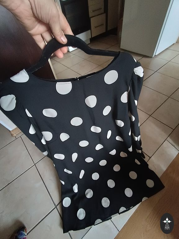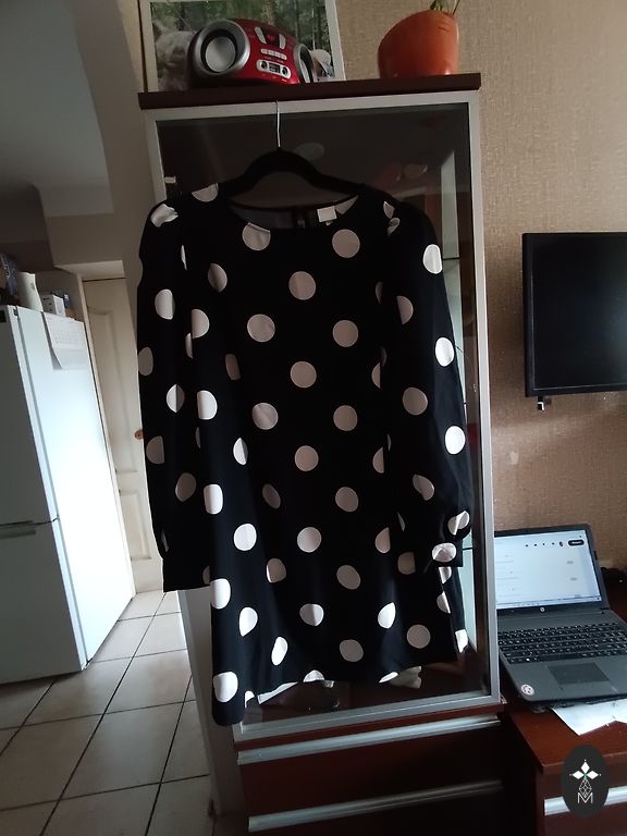 Красивая, яркая, эластичная платье. На груди карманы с иллюстративным значением, по бокам реальные карманы. Карманы и концы рукавов обработаны серебристой тканью. Больше подходит как осеннее платье или для прохладного лета. Грудь 114-120 см, длина 102 см.