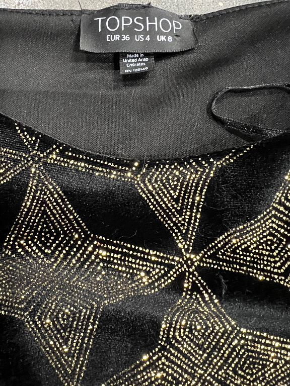 Thick, high-quality fabric that keeps its shape. Lace along the bottom edge and lace inserts on the sleeves. Short. Can be worn as a tunic. Worn 2-3 times.