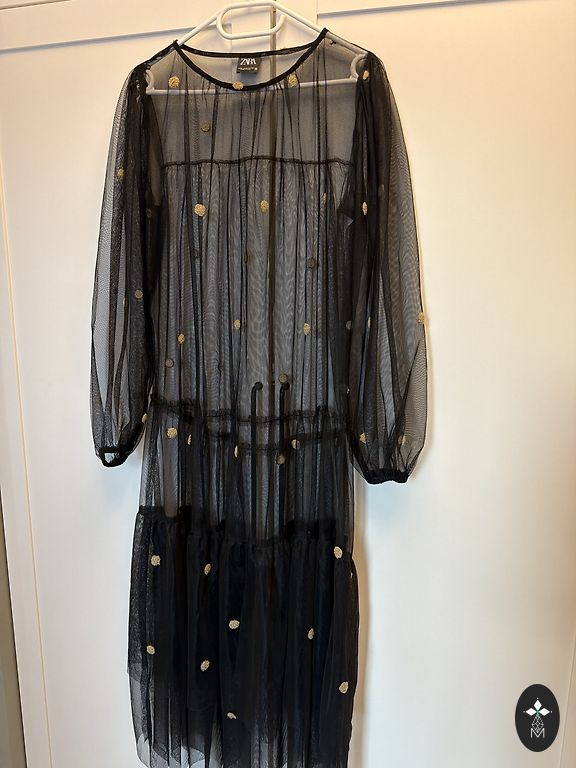Midi garuma kleita, M izmērs. Sānā ir rāvējslēdzējs. Materiāls - poliesters un elastāns. Rokas ir nedaudz caurspīdīgas. Nav defektu. Varu nosūtīt vēl kādu bildi vai izmērus.