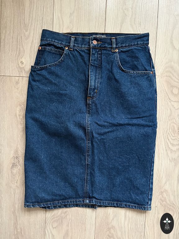 Tamsiai mėlyni, madingi sijonai. Labai mažai dėvėti, manau, geriausiai tiks 36-38 dydžio, netgi labiau 38 dydžio. Galima dėvėti tiek su diržu, tiek be jo. Nugarinėje pusėje yra skeltukas, kuris matomas ir nuotraukoje. Artimiausia tikrovei spalva yra antroje nuotraukoje. Defektų nėra.