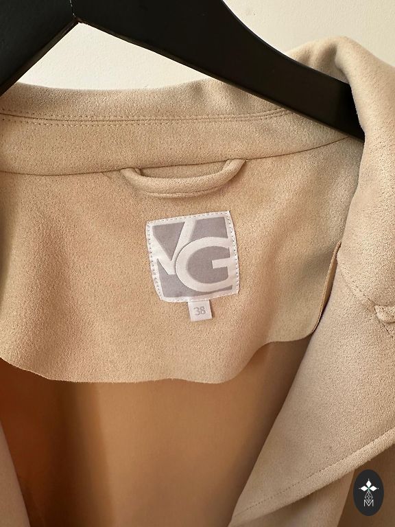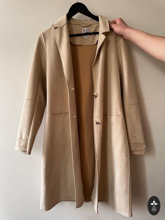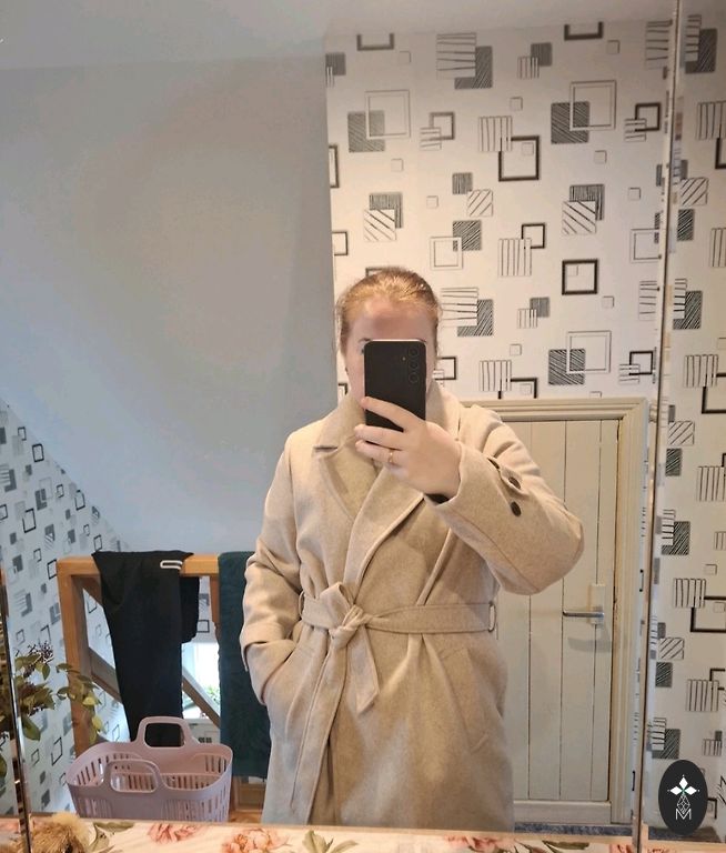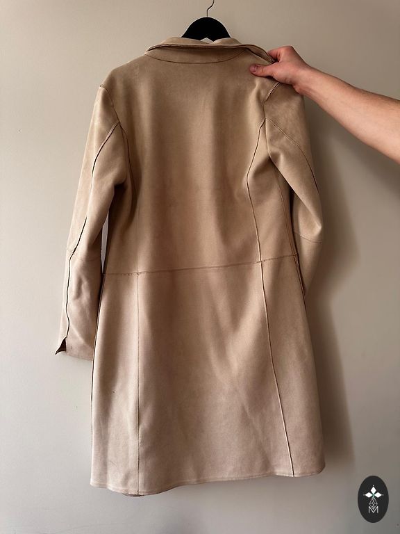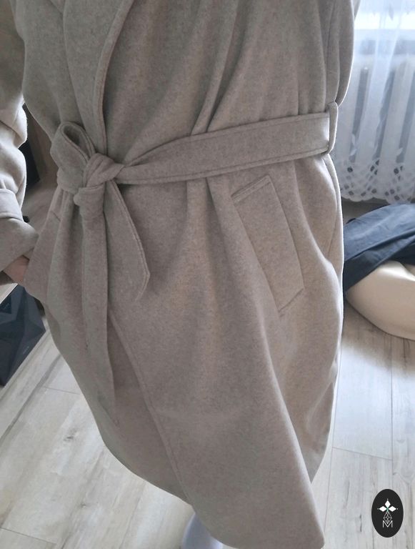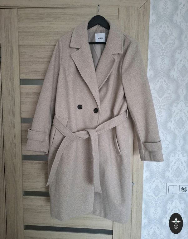 Skaists mētelītis uz 46 izmēru, vilkts vienu reizi un pēc tam iztīrīts ķīmiskajā tīrītavā, bēšs ar smalkiem izšūtiem ziediem, ar jostiņu, ir kabatas.