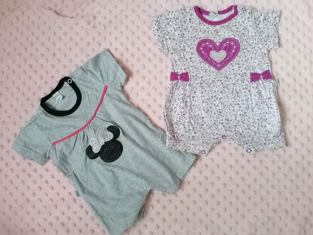 Vasaros bodžių komplektas 74 dydžio iš įvairių prekės ženklų, vienas bodis su ilgomis rankovėmis (muslinas), vienas romperis.