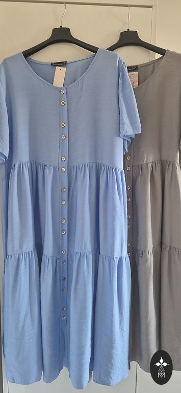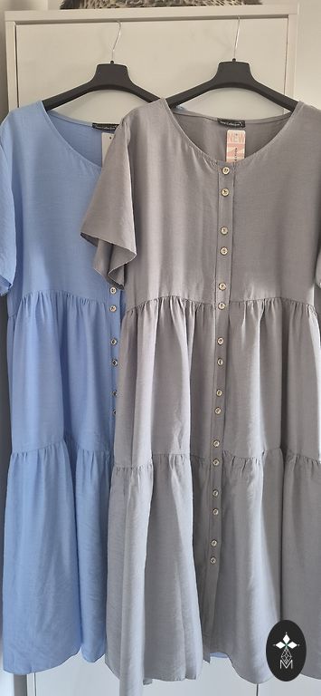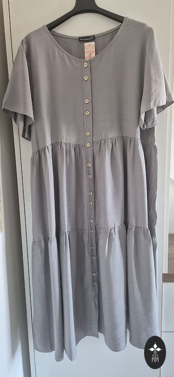 NAUJA 3XL suknelė su dviem audiniais priekyje, pagaminta iš vėsaus viskozės audinio. Spalva – tamsiai ir šviesiai pilka. Šonuose yra įpjovos. Suknelė lieknina figūrą, nes diržas gali būti surišamas tik priekyje.