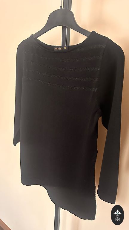50 % viskozė, 40 % medvilnė, 10 % šilkas. Priekinės dalies ilgis 52 cm, šonų ilgis 60 cm. Nugaros dalis juoda.