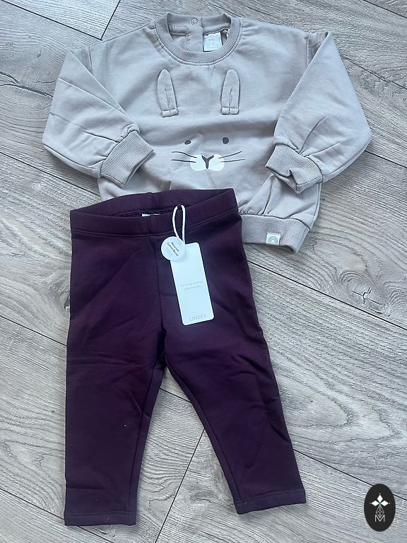 Naujas Lindex komplektas. Visi 86 dydžio. Pilkas spalvos bodis. Kūno spalvos bodis su šuniukais ir kelnės su nedideliu pašiltinimu. Ant užpakalio šuniukas🐶