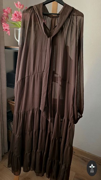 Ilus kleit koos eraldi kantava tumedapruuni, õhukese, satiinist alusseelikuga (vooder), millel on õlapaelad. Mugav kanda, visuaalselt salendava efektiga. Vähekasutatud. Sobib nii ametlikeks igapäevasteks kui ka õhtusteks üritusteks. Mõõdud – pikkus 124 cm, laius rinna all – 50 cm, varrukas – 62 cm. Hind 25 eur + kohaletoimetamine.