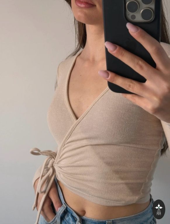 Lace Beautiful semi-transparent blouse/top. Additional fabric on the front to prevent transparency, ruffles on the sides from the shoulders. Also fits size M (I wore a small M), unfortunately it no longer fits me after having children, looks very beautiful and feminine. A skirt in the same shade is also available, which I bought as part of a set.