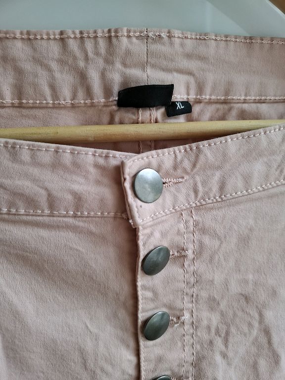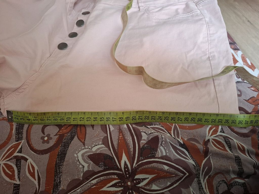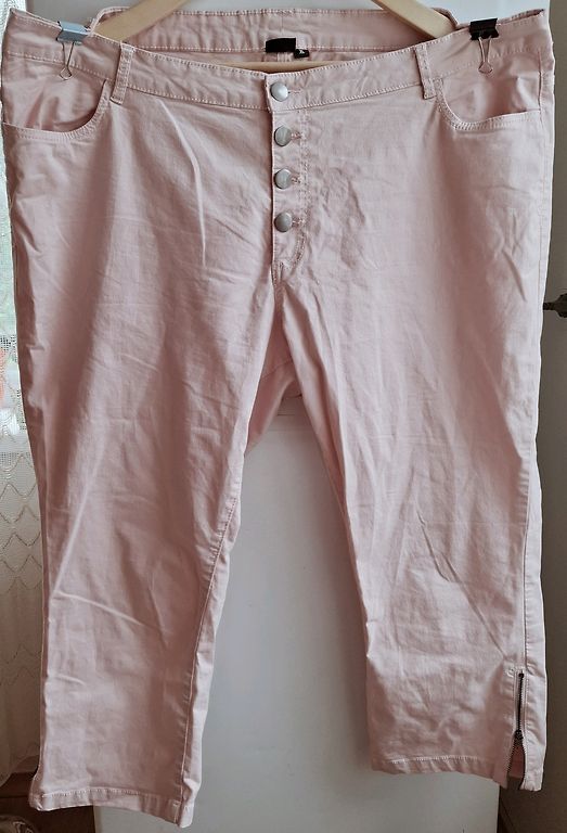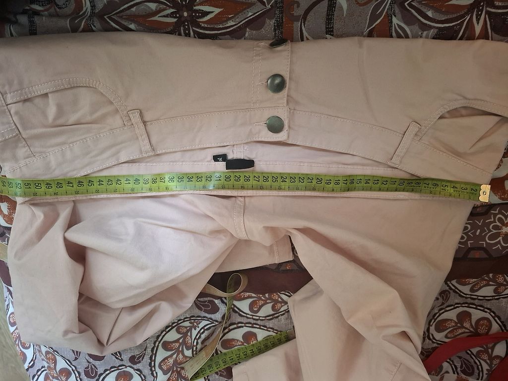Bežid kapri püksid emalt. Mõõdud: vöökoht - 57cmx2, puusad - 65cmx2, sisepikkus - 65 cm, välispikkus - 89 cm. Pükste otstes lukud, kinnitus - metallkonks ja lukk, vöökohta saab reguleerida kummiga ja pingutitega. Kangas ei ole elastne.