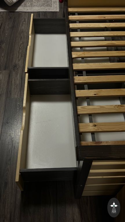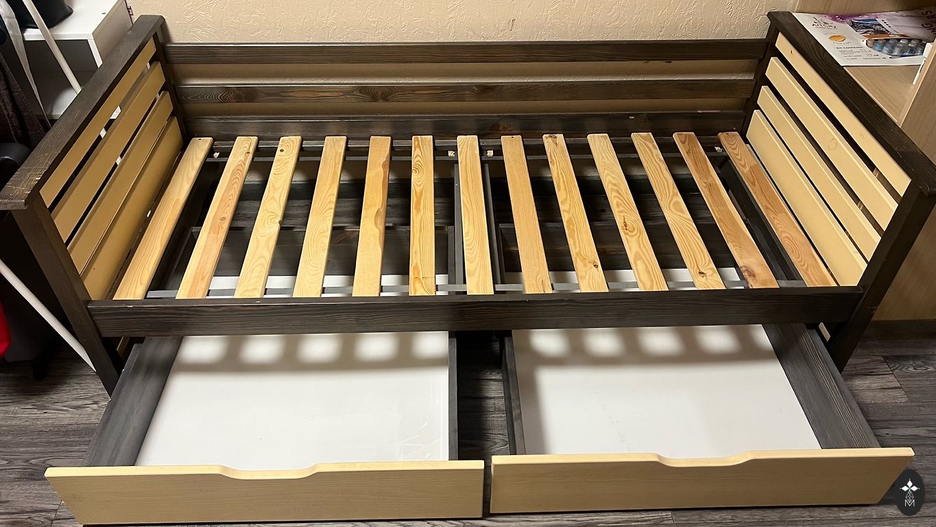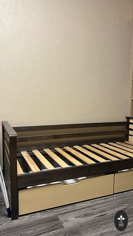 Galdnieka izgatavota bērnu gultiņa ar regulējamiem augstumiem. Gultas vienā sanā atrodas skapīts ar plauktiem! Garums 152 cm, Augstums 39 cm, platums 65 cm