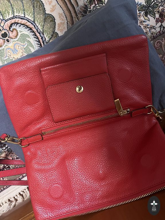 Ļoti ietilpīga rokas soma, var nēsāt arī uz pleca, garums 45, augstums 38, platums 16 cm., klāt nāk maciņš, aizveras ar kniedi, ārpusē sarkana, iekšpusē zelta krāsā. Zinu, ka jautāsiet: rokturi pilnīgi nemanāmi noberzušies, apakšmala arī, uz foto to var redzēt izteikti, bet dzīvē pilnīgi nemanāmi.