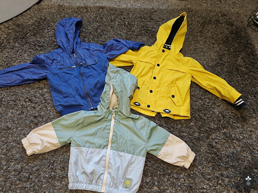 Куртка с наполнителем, довольно теплая, на осень. С карманами. Есть дефекты, которые видны на фотографии: разорванный карман и небольшое пятно на молнии.