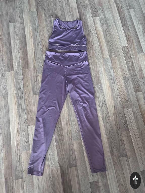 Мягкий, теплый, с капюшоном и карманами, красивого цвета. Смешанный материал, замша с полиэстером. Брюки узкие с белой тесьмой.