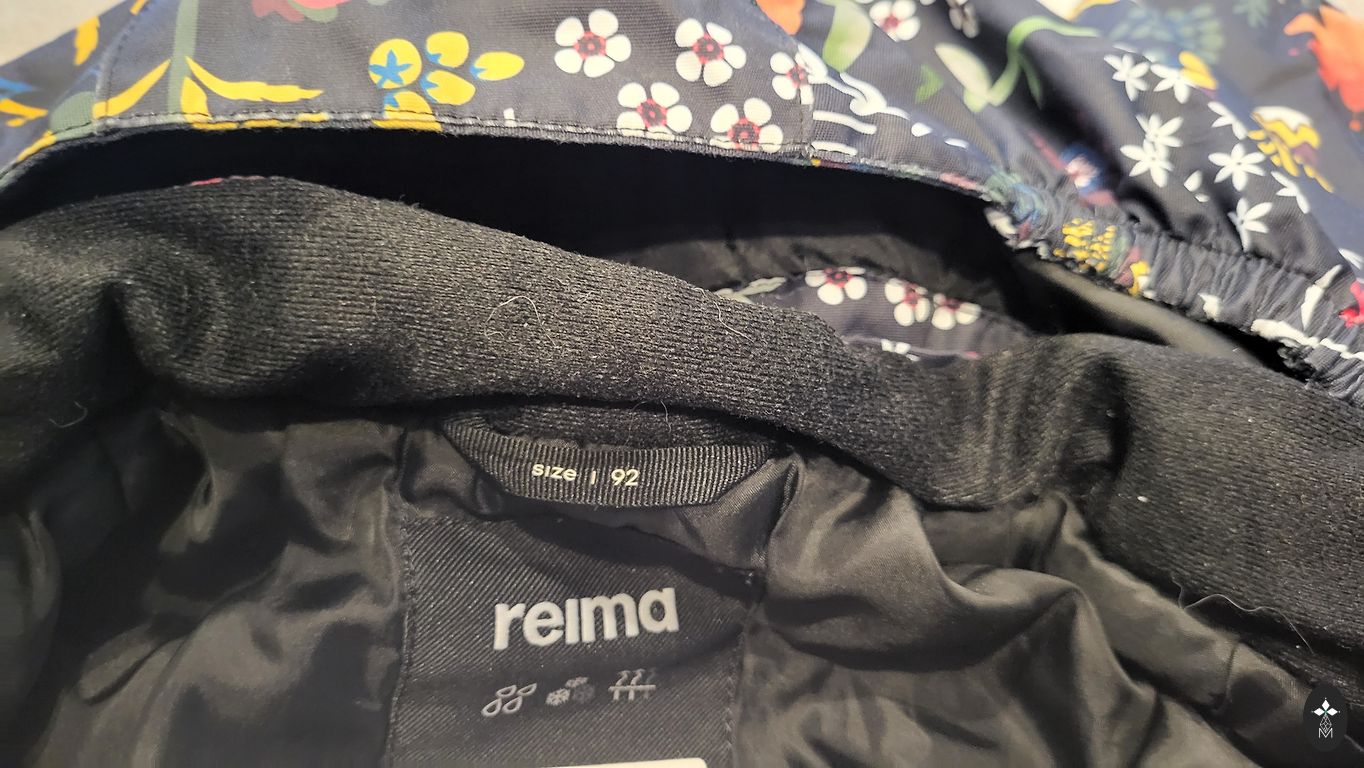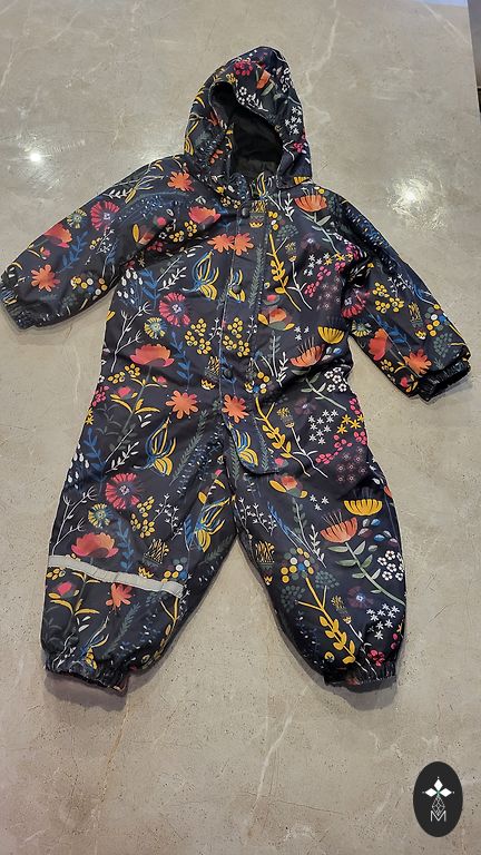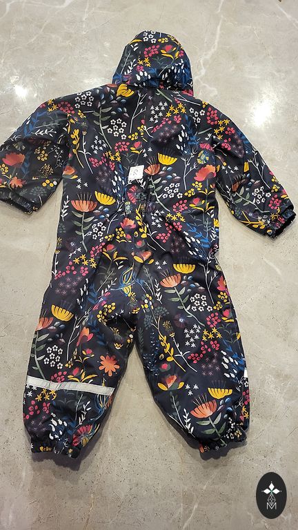 Очень толстый, теплый костюм, выстиранный. Куртка удлиненного типа. Производитель указал размер 98.