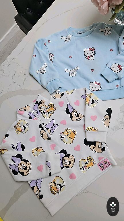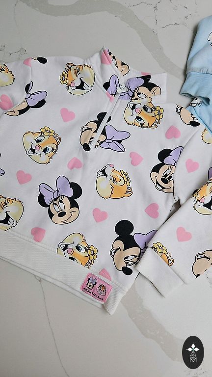 Baltos spalvos megztukas su moters piešiniu. Piešinys yra keičiamas. Megztuko apačioje yra balta marškinėlių kraštinė. Megztukas mažai dėvėtas. Megztuko ilgis yra 50 cm. Rankovių ilgis, matuojant nuo viršutinės dalies, yra 47 cm. Tinka 7 metų vaikams iki 122 cm.