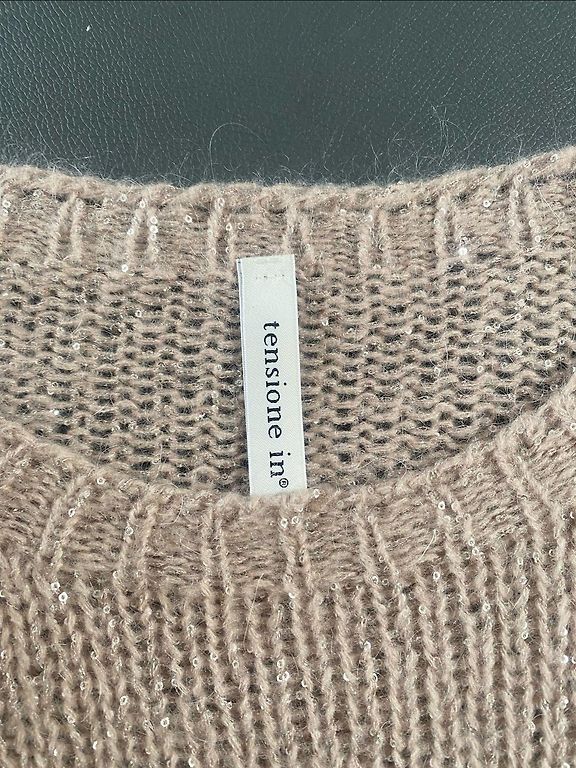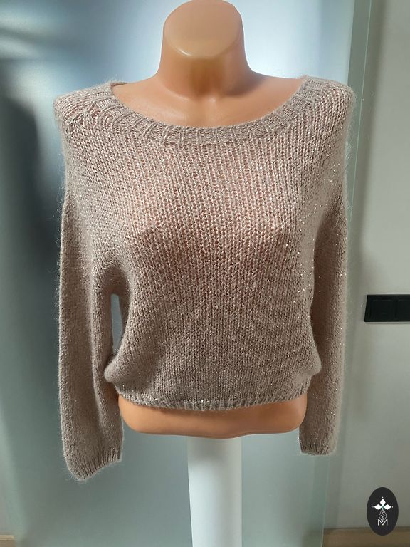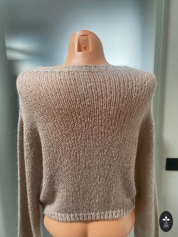 Vilnonis megztinis su marškinių tipo apykakle. Šonuose yra mini sagutė, kuria galima užsegti gale ir sukurti prigludusį megztinį (2 paveikslėlis). Tinka XS ir S dydžiams. Nėra jokių defektų ar dėvėjimo požymių.