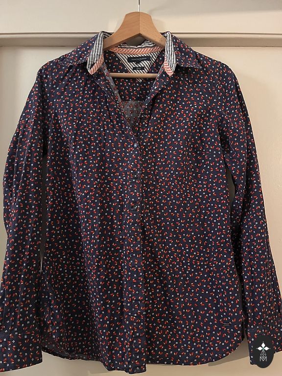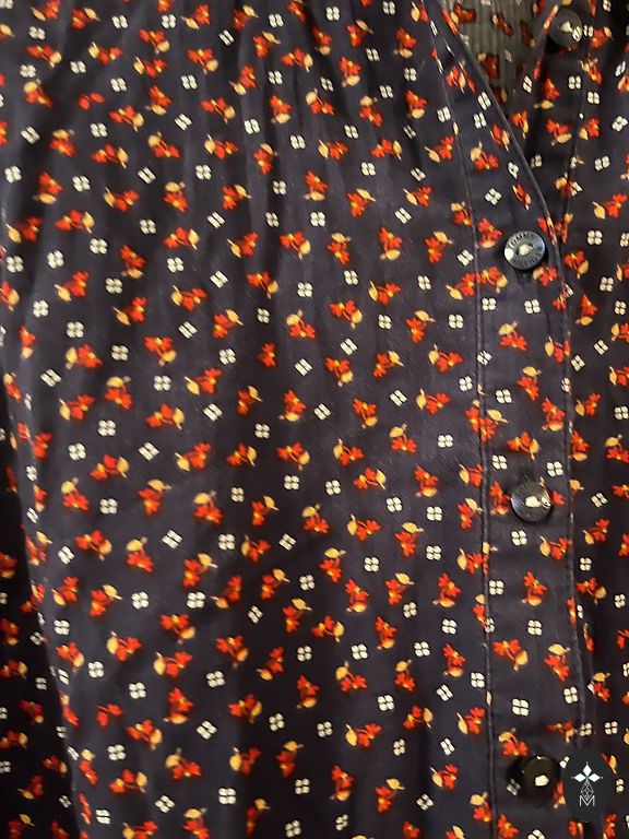 Элегантная хлопковая блузка, завязывающаяся на талии, ткань с рисунком, с синими пятнышками, красивая, грудь 96 см, плечи 38 см, длина 66 см, рукава 45 см. + доставка.