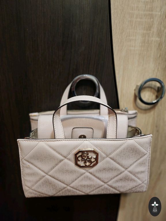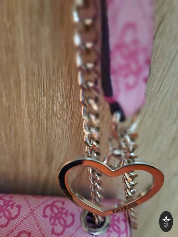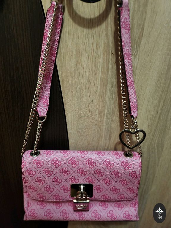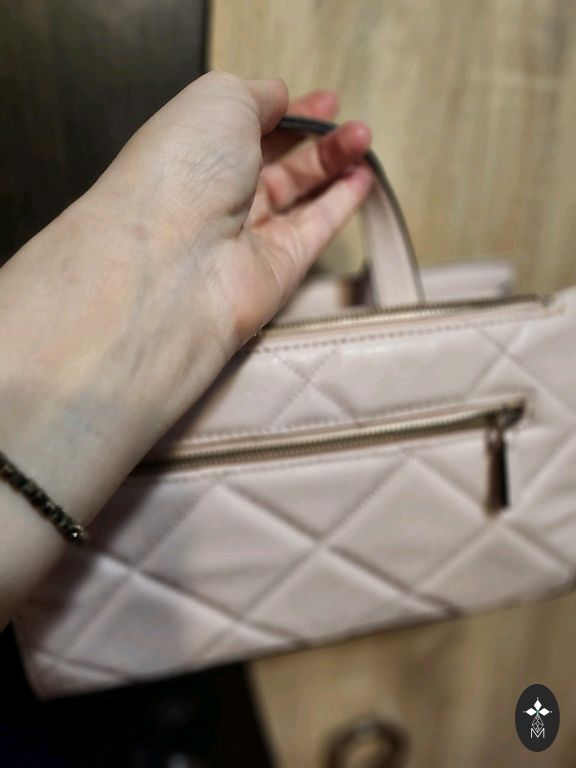 Graži, vidutinio dydžio, tvirta dirbtinės odos rankinė švelnios rožinės spalvos. Pamušalas iš dirbtinės odos švelnios pilkai rožinės spalvos. Komplektuojama su dviem ilgais dirželiais – vienu siauru dirbtinės odos dirželiu ir vienu plačiu audinio dirželiu. Galima nešioti kaip rankinę (per petį) arba kaip rankinę. Rankinės viduje yra