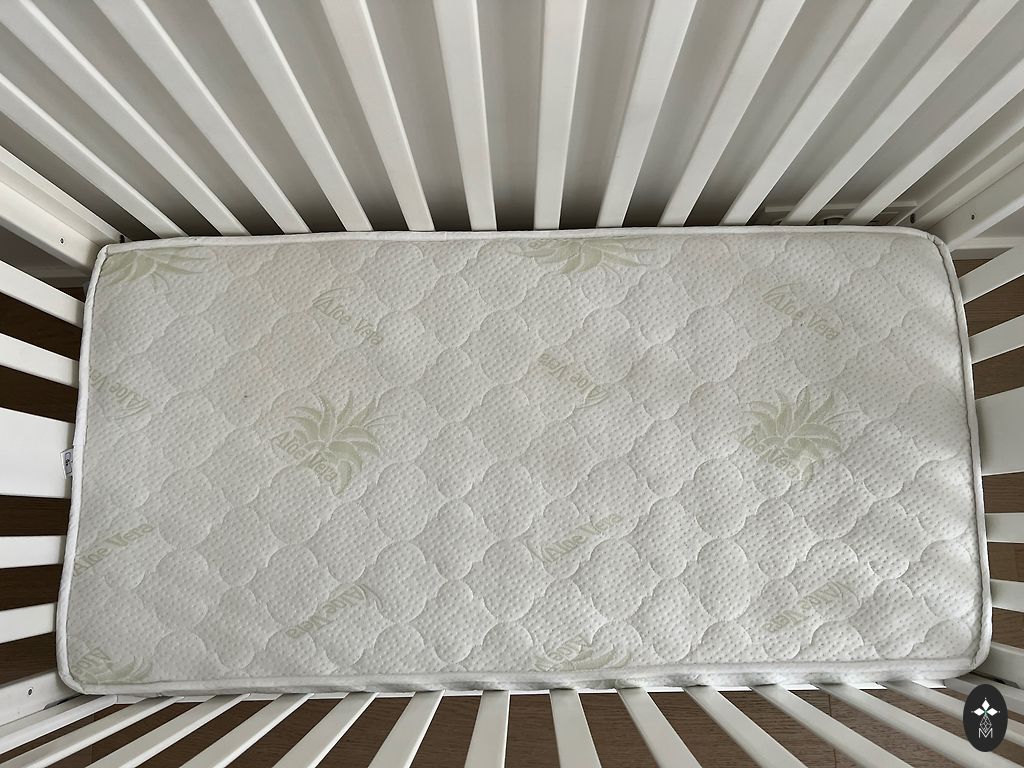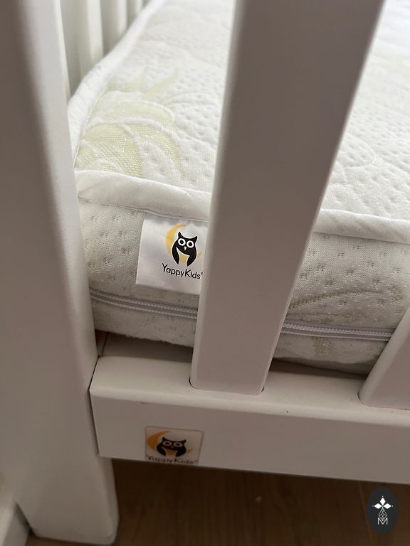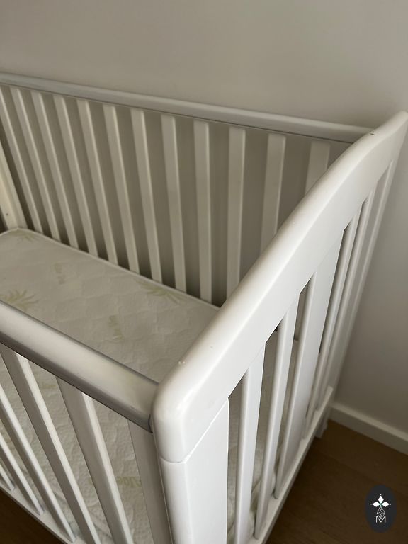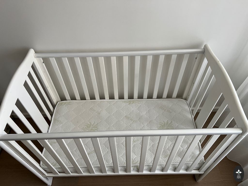 Кроватка + матрас. Размер 60*120. Кроватка регулируется по высоте в 3 уровнях. Одна сторона опускается, также можно снять одну сторону. Есть 2 съемные рейки. На боковых сторонах пластиковые защитные накладки.