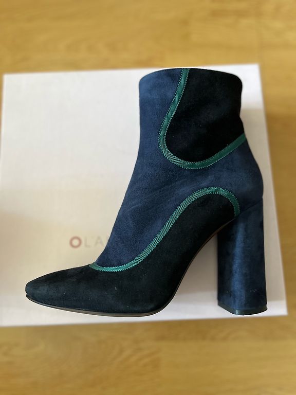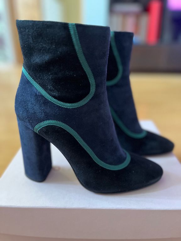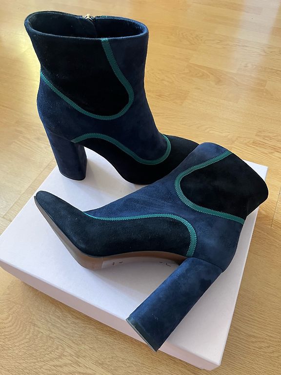 ▪︎ Vidinė padas 26 cm ▪︎ Kulno aukštis 12,5 cm ▪︎ Platformos aukštis 3 cm ▪︎ Kulno aukštis 10,5 cm Natūralaus suede aukštakulniai bateliai iš ELCHE. Su platformos pado ir dekoratyviniu raišteliu priekyje. Viduje šiek tiek šiltos. Tikras užsegimas su užtrauktuku šone. Batai gali turėti minimalių natūralių nusidėvėjimo požymių ant viršaus. Ant kulno yra nedideli įbrėžimai.