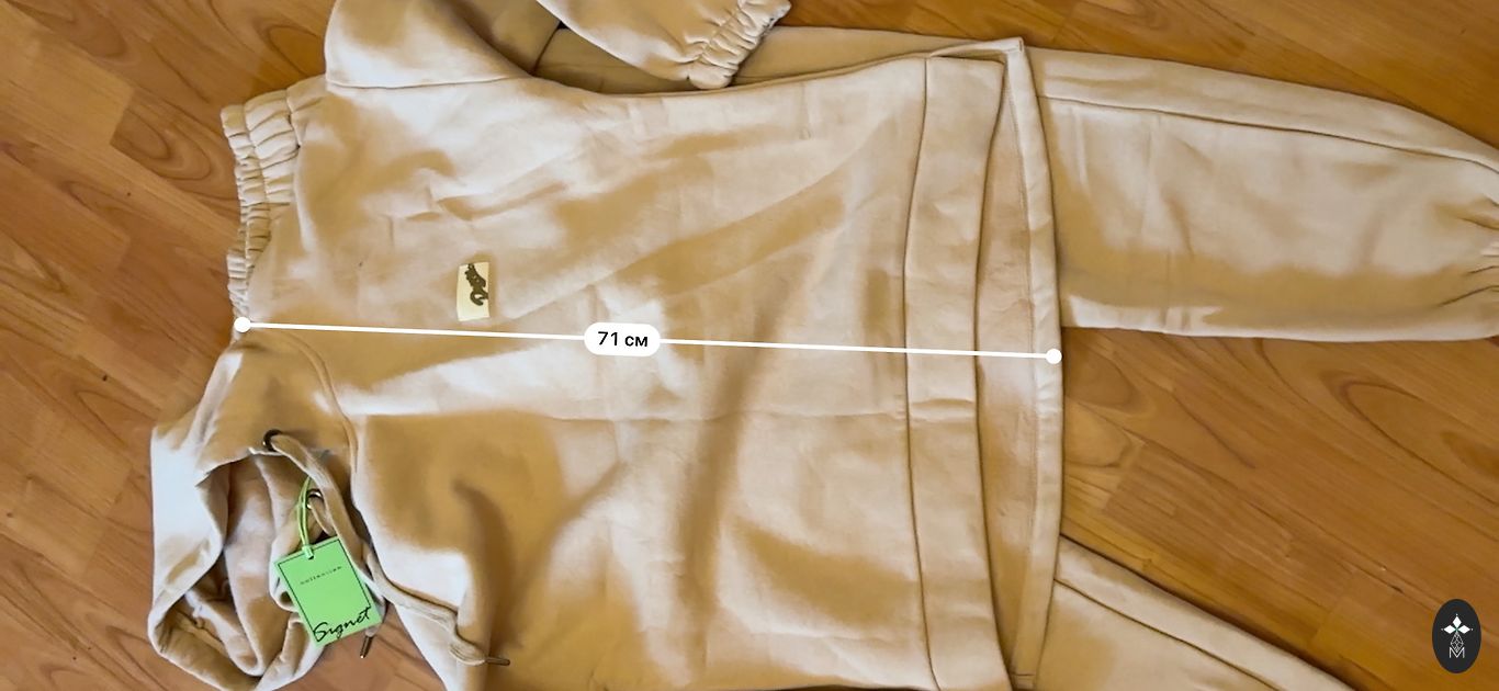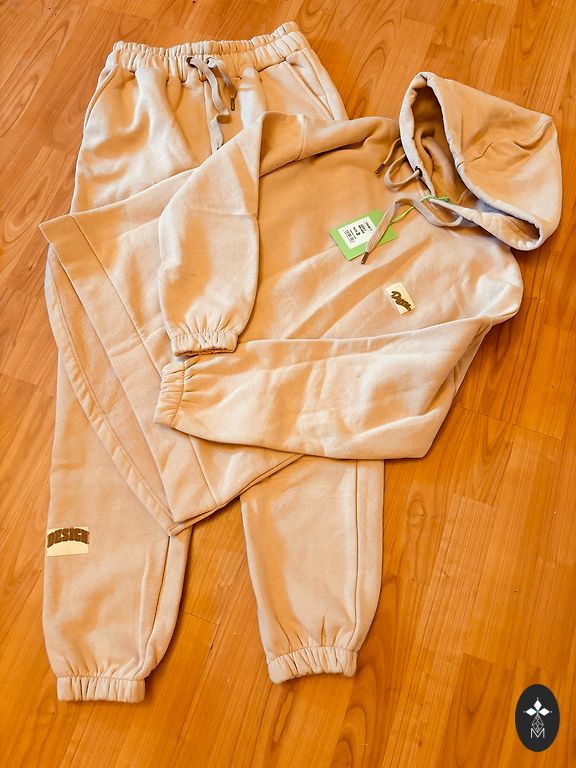 Parduodamas naujas, šiltas, stilingos sportinis kostiumas rudos spalvos. Modelis - Oversized. Dydis M-L. Nugaros ilgis - 72 cm. Rankovė nuo pečių - 56 cm. Rankovė nuo kaklo - 74 cm. Krūtinės plotis - 63 cm. Priekinis ilgis - 61 cm. Kelnių apimtis - liemuo - 38 cm. Klubai - 55 cm. Kojų ilgis be diržo - 98 cm. Su diržu - 104 cm.