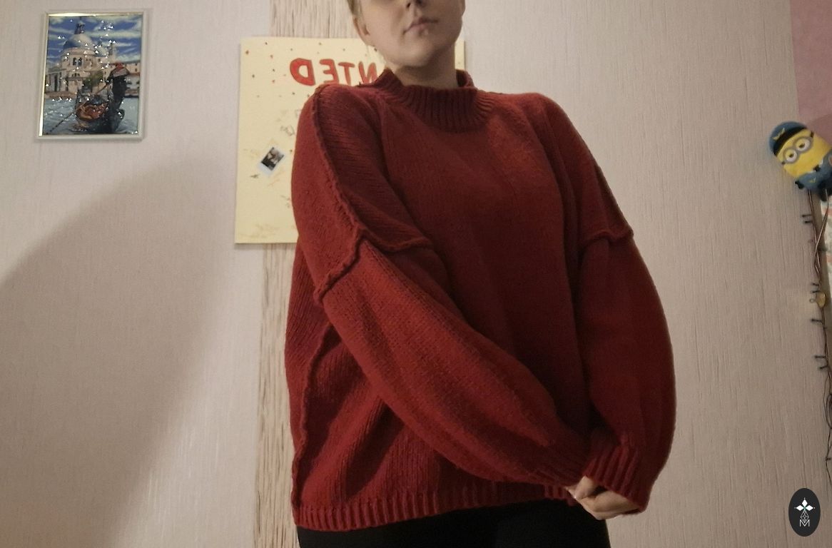 Ярко-зеленый свитер, рукава кимоно, лодочный вырез, длина от шеи 62 см, длина рукава от шеи 74 см.