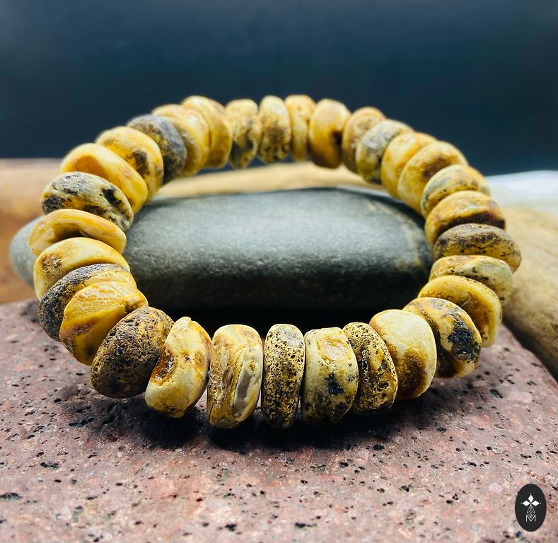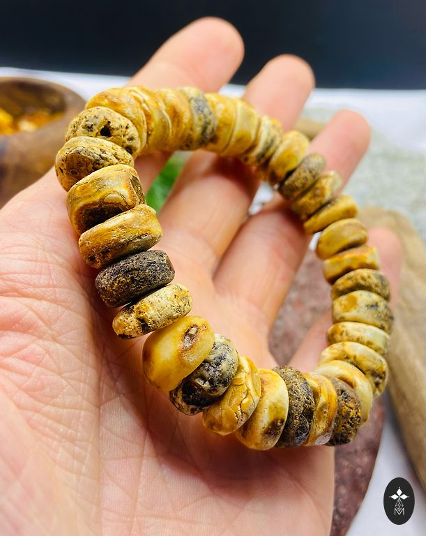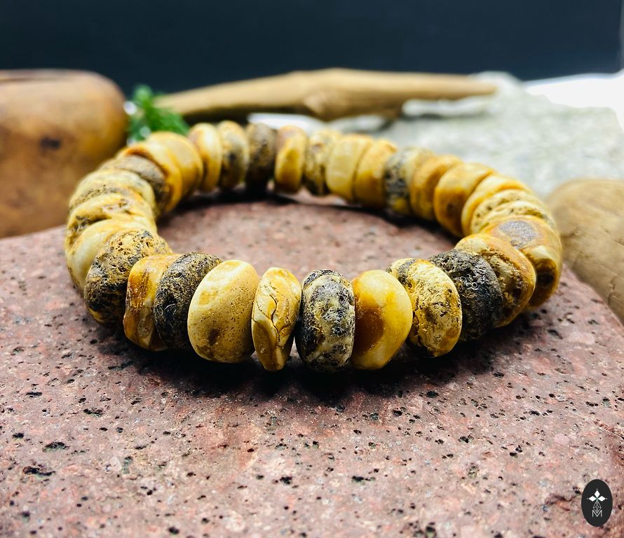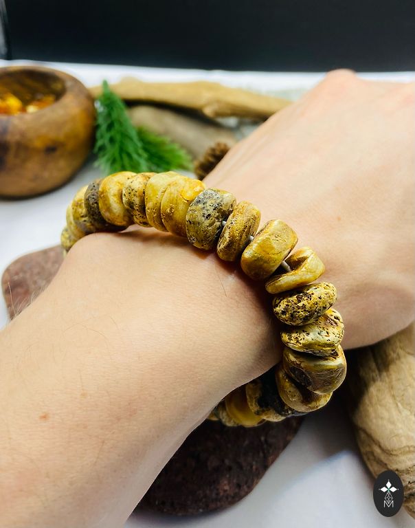 Rokassprādzes apkārtmērs: 20 cm (var mainīt). Dzintara odziņas ir 1.2 cm gari. Dzintara matrica ir 1.6x1.5x1.6 cm.