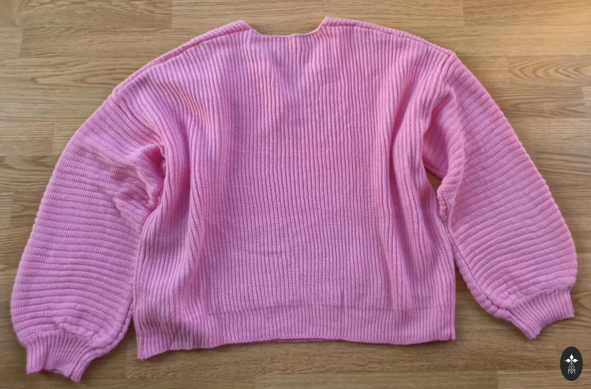 Pārdodu stilīgu džemperi, izmērs L. Ļoti interesants dizains ar krāsu kombināciju (oranžs, pelēks, bēšs) un dekoratīvu elementu priekšpusē, kas piešķir īpašu akcentu.