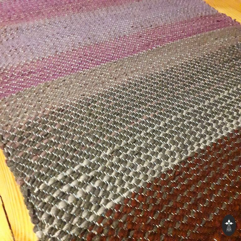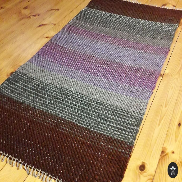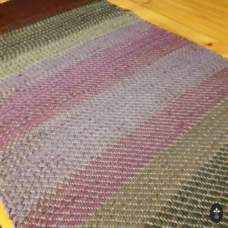 Iš perdirbtų tekstilės atliekų austas kilimas/grindų kilimėlis. Ilgis 1,75 m, plotis 0,68 m.