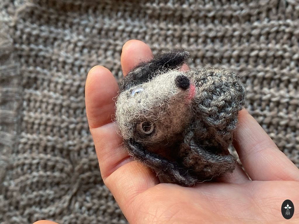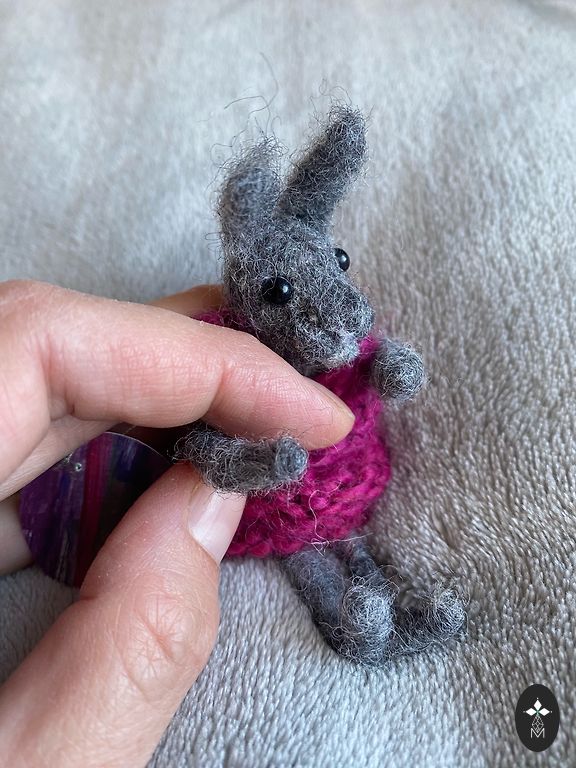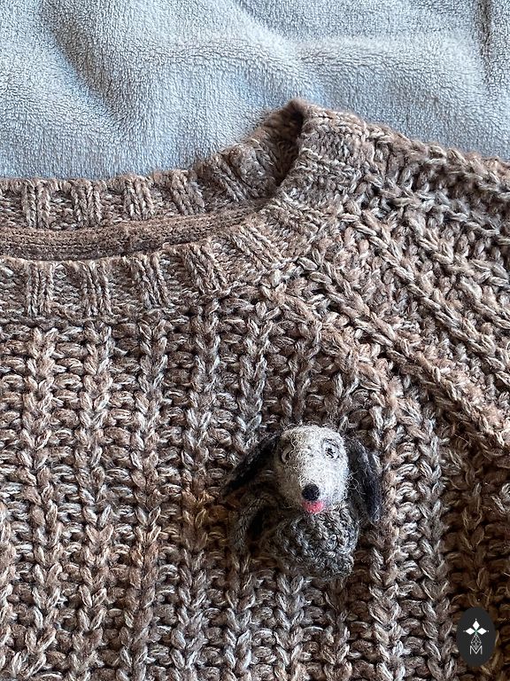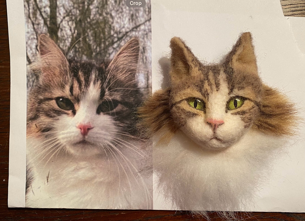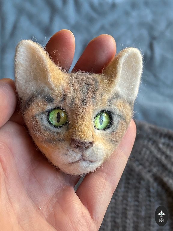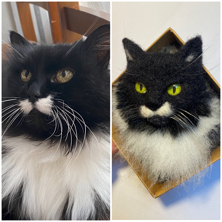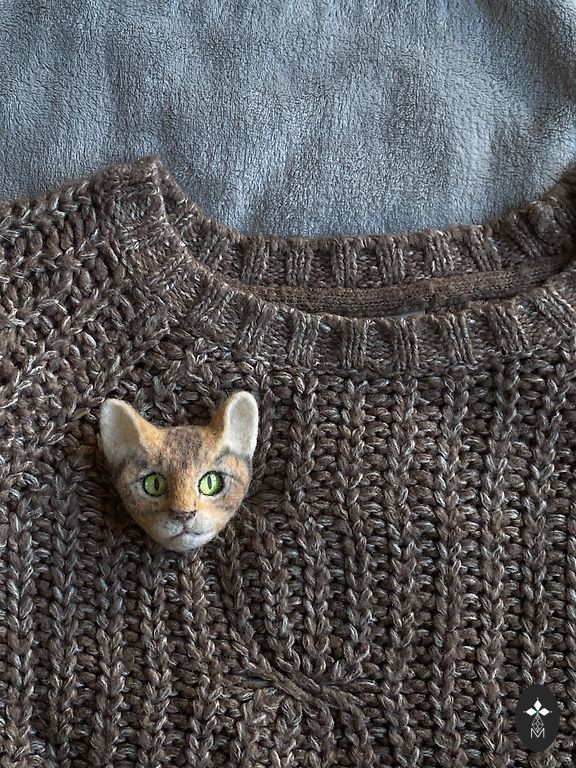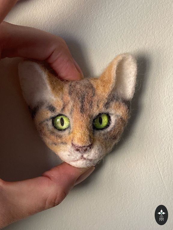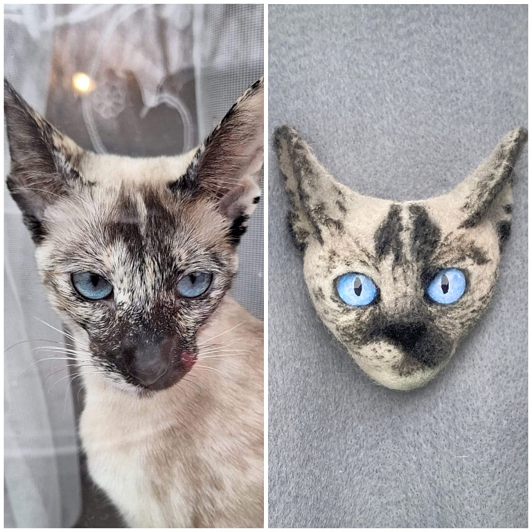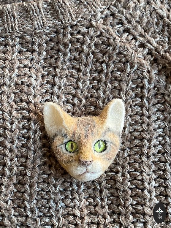 Katės sagė, pagaminta iš vilnos, veltinė adata.