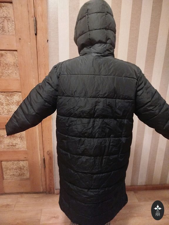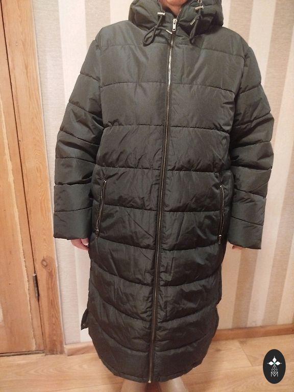 Naujas paltas su etiketė. Labai šiltas. Ilgis nuo apykaklės iki nugaros apačios 110 cm, rankovių ilgis 66 cm, pečių plotis 11,5 cm, po pažastimis 69 cm... Etiketėje nurodyta 46 dydis.