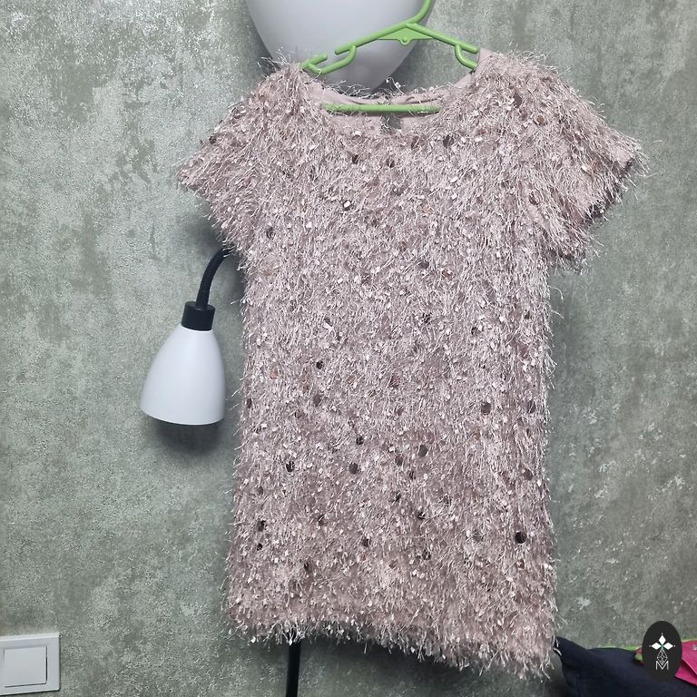 Kleit lasteaia lõpupidamiseks, ilus toon, õrnalt beeži ja heleda, heleda roosa vahel. Vöökohas seotav pael. Pikkus umbes 72 cm.