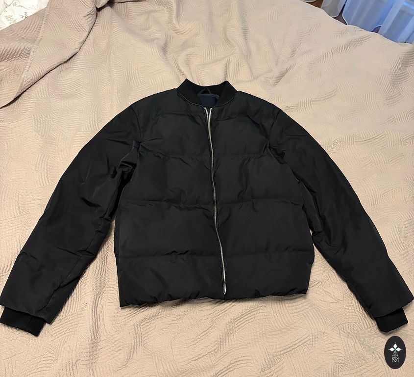 Interesting zipper placement - diagonally. The jacket is quilted. The bottom is asymmetrical - looks good and elegant on the body. Sleeve length is 60 cm, the jacket length is 63 cm. Without a hood, standing collar. No defects.