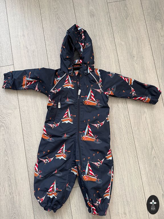Labai geros būklės, išskyrus mažą dėmę ant nugaros, kurios negalima išplauti (mažasis atsisėdo ant statybinių medžiagų, bet uždėjus vaikui ant nugaros dėmė nesimato), bet visa kita puikios būklės. Nėra skylių, gumos, užtrauktukas sveikas.