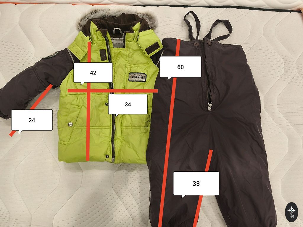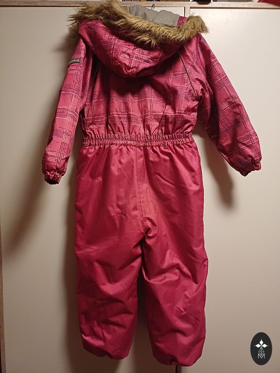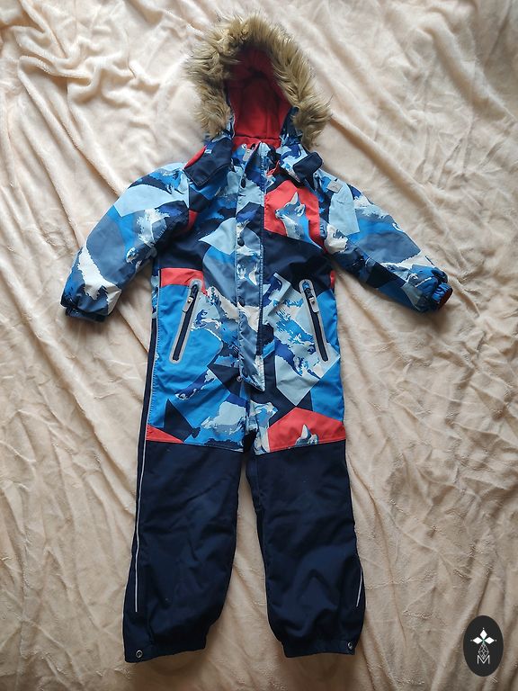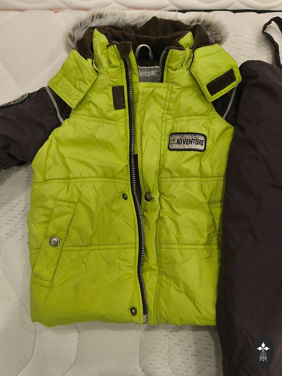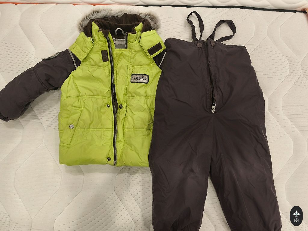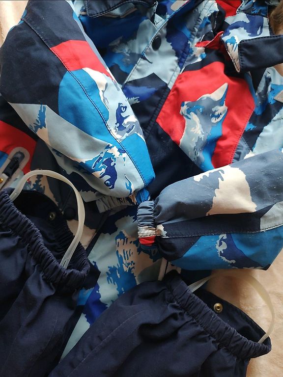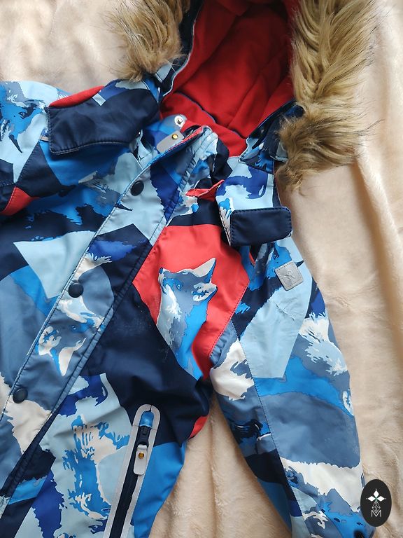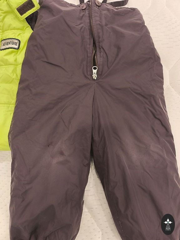 Žieminis kombinezonas, dydis 92. Ant kojų nėra gumos, bet galima pridėti naują, nes yra likę smeigės. Trūksta originalaus užtrauktuko, bet tai neturi įtakos jo naudojimui.