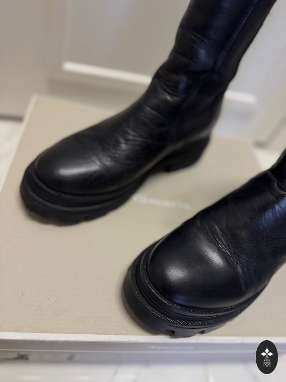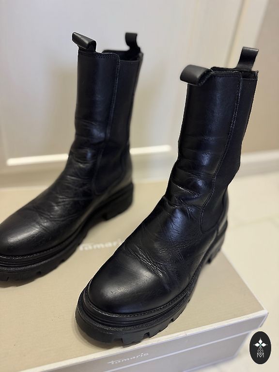 Dydis 39. Naudoti kelis sezonus. Vienoje iš nuotraukų matyti, kur oda įtrūko sulenkimo vietoje. Kulniukai buvo pakeisti ir dar nėra nusidėvėję.