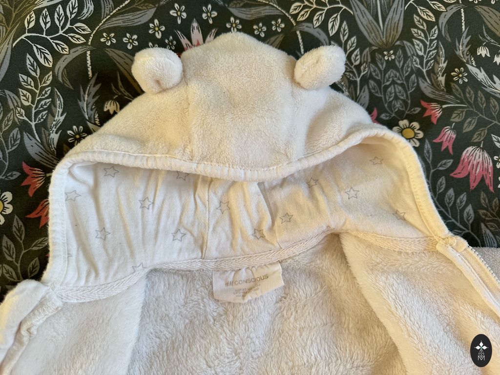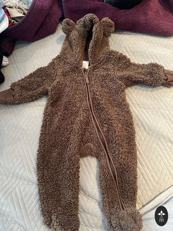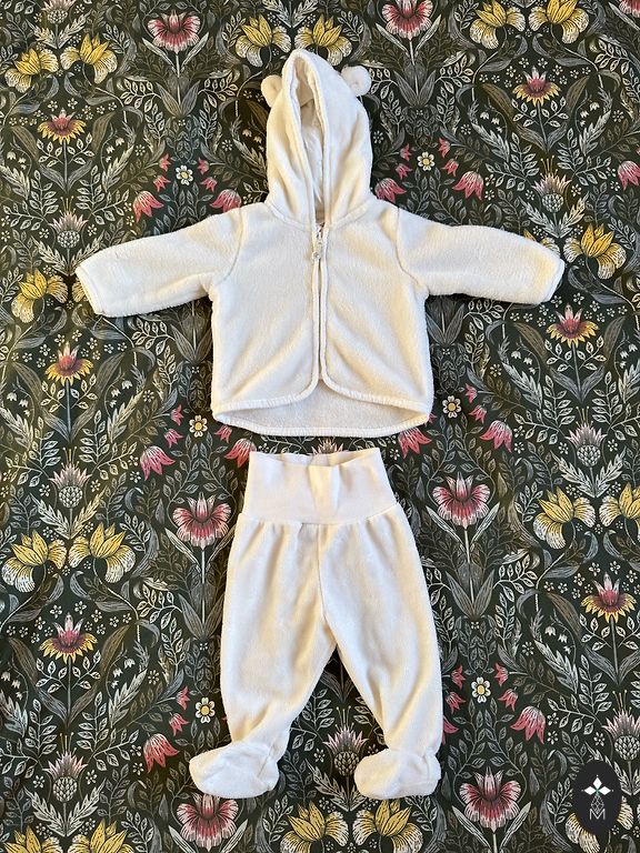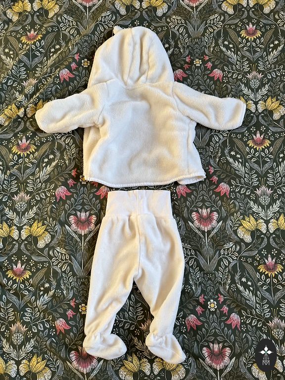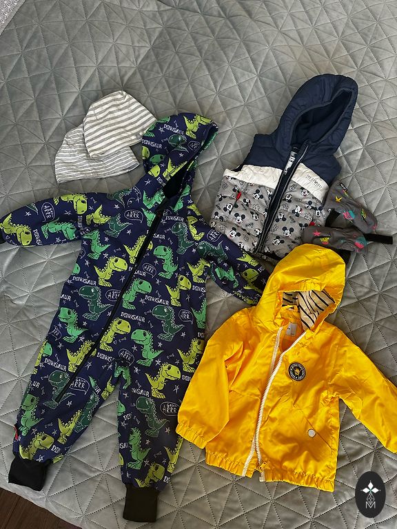 Красивый межсезонный комбинезон для малыша. Нет ни дыр, ни пятен. Внутренний материал немного скатался от использования, но в целом все в очень хорошем состоянии. Откидные ручки и ножки. Производитель указывает размер 74, но я бы сказал, что лучше подходит и легче надевать на 62/68. Длина от плеча до ноги 68 см.