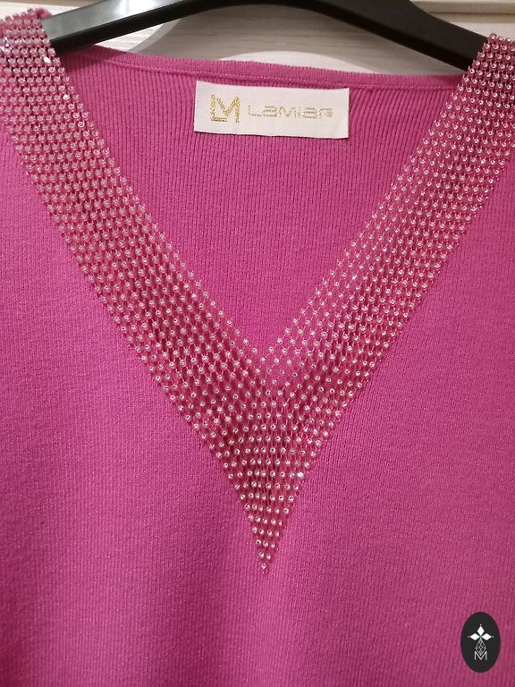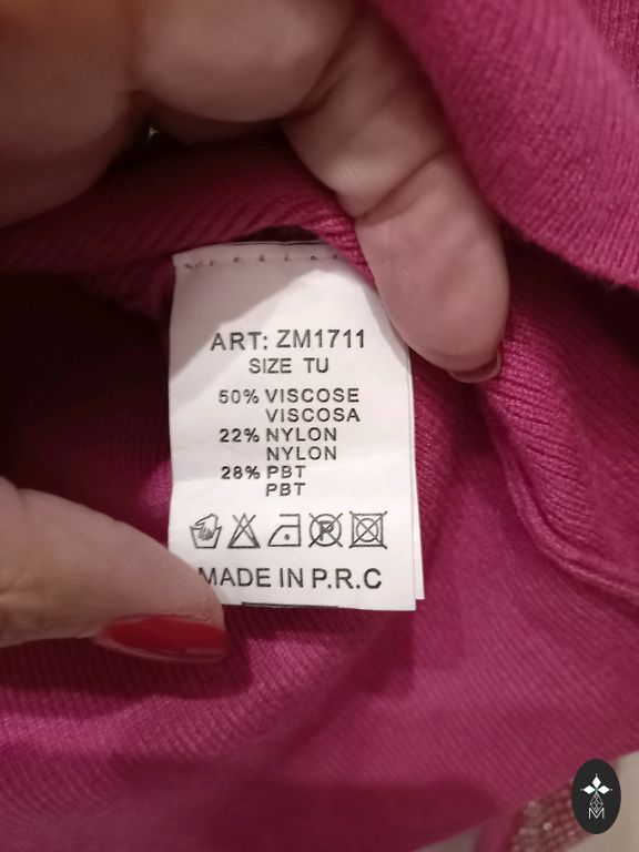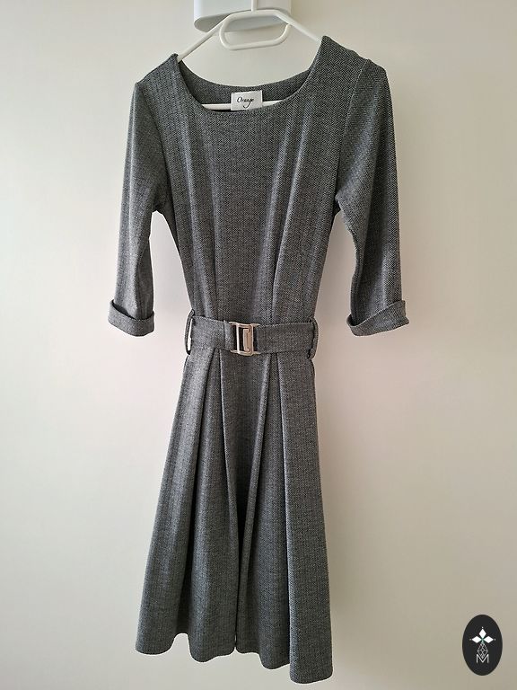 Suknelė, ilgis 83, krūtinės apimtis neištempus 104, išsitempia iki 120. Sudėtis: viskozė 35%, kašmyras 5%.