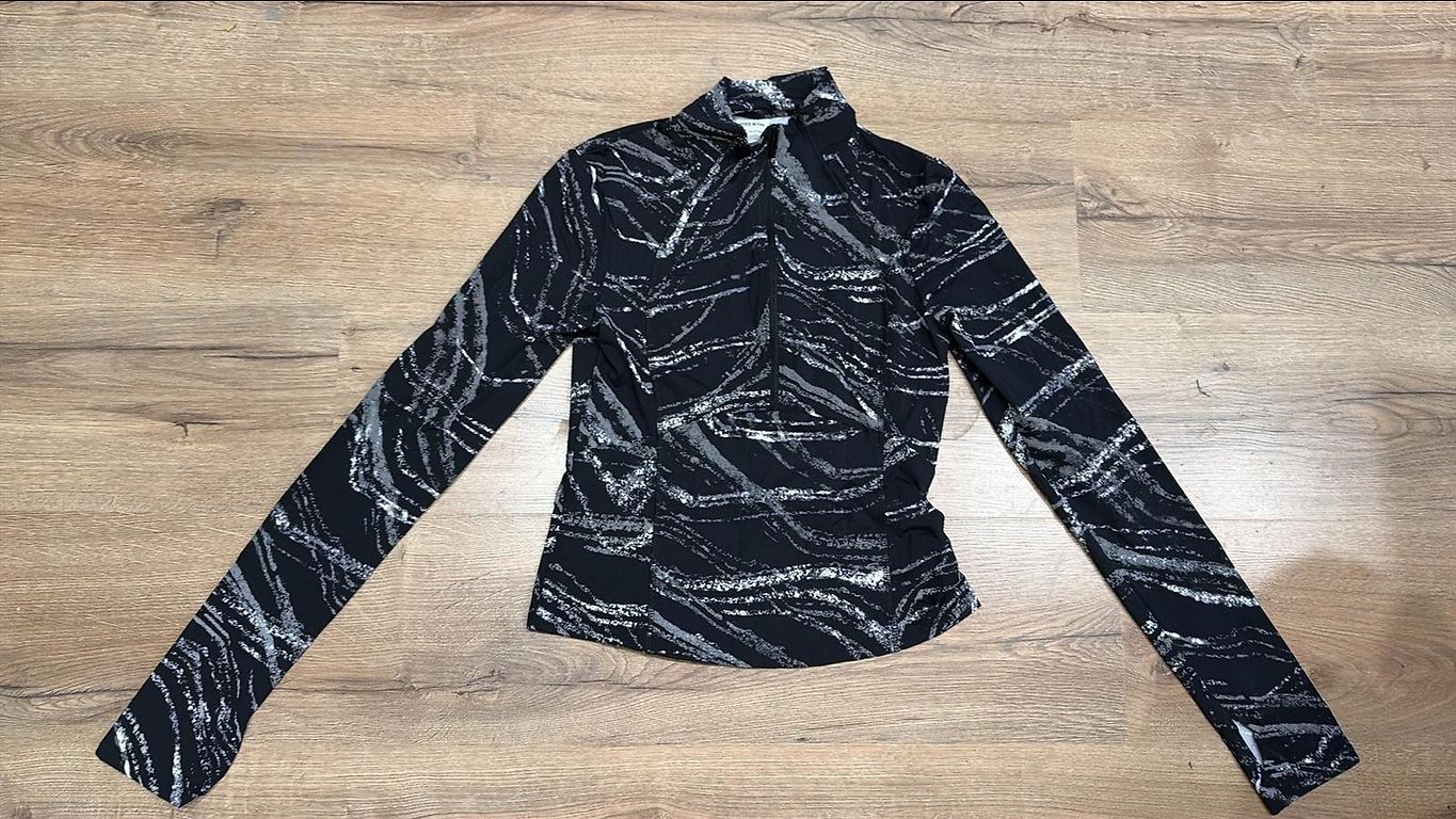 Laisvalaikio striukė su uždaromis išorinėmis kišenėmis ir viena vidine kišene (su užtrauktuku). S/M dydis. Striukė be defektų. Striukės ilgis 69 cm, krūtinės apimtis 100 cm, apatinės dalies/klubų apimtis 108 cm, rankų ilgis apie 58 cm.