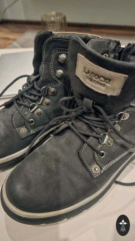 Dabīgas ādas zābaciņi starpsezonai/ START-RITE. Ir valkāti 1 sezonu. Zolītei ir redzams valkāšanas nodilums (4.foto), toties ādas kvalitāte ir nevainojama un kalpos vēl ilgi. Dabīgā āda ir zābaciņiem gan ārpusē, gan arī iekšpusē. Zābakiem ir tumša Navy blue krāsa un START- RITE zīmols.