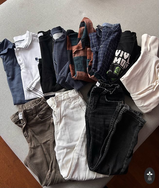 5 krekli ar garām rokām, džemperis, treniņbikses un džinsas, ziemas cepure.