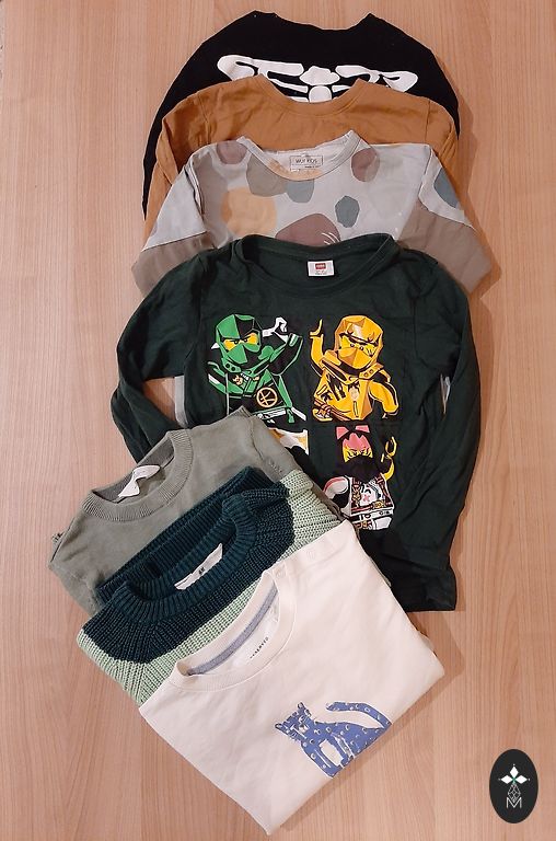 5 рубашек с длинными рукавами, свитер, спортивные штаны и джинсы, зимняя шапка.