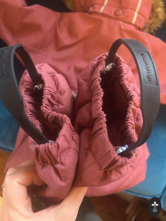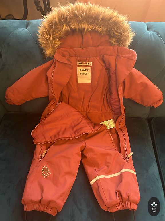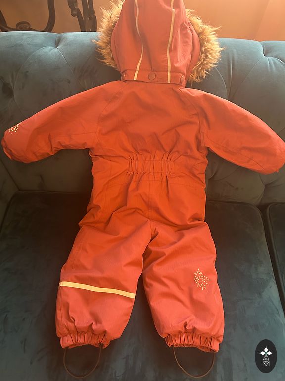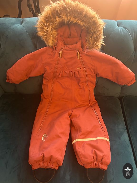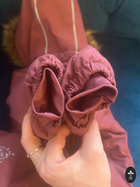 Bright and very warm winter jumpsuit with two zippers, allowing the child to be placed effortlessly - for the little lady in size 80, it will fit longer as there is some room. The hood can be removed.