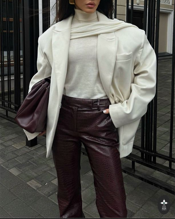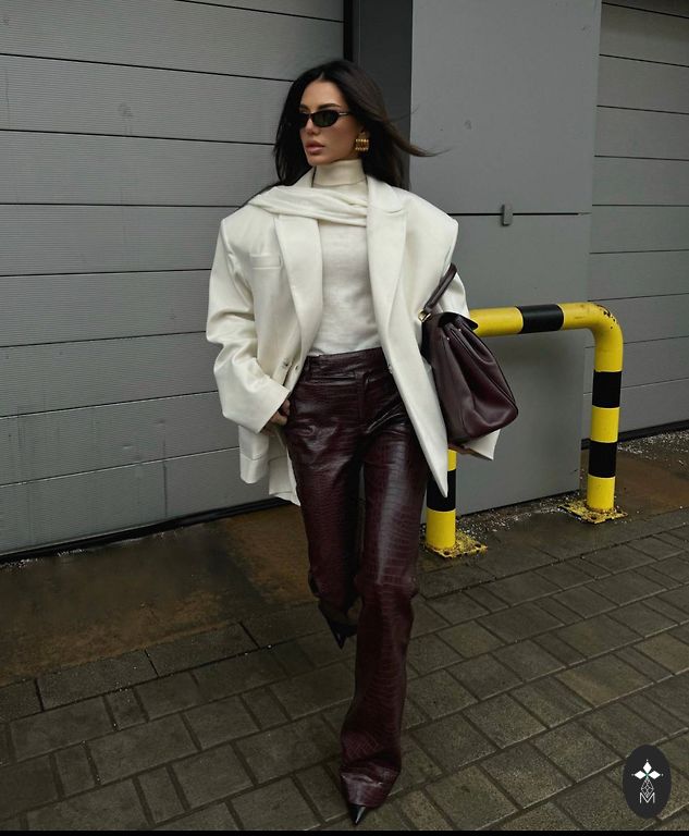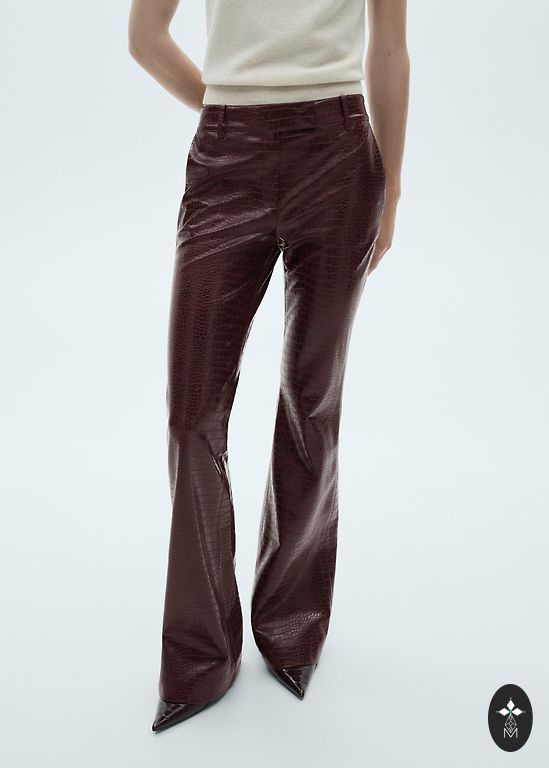 Dirbtinės odos kelnės su vidutiniu liemeniu, tiesiomis kojomis ir iki kulkšnies ilgiu.