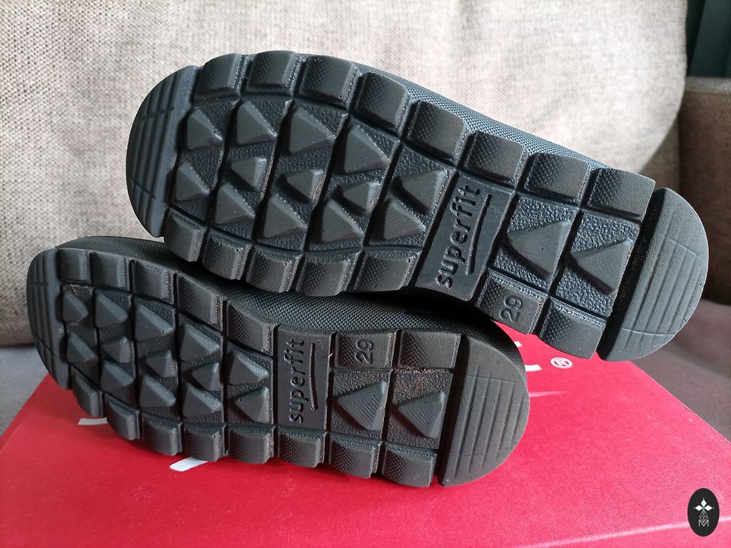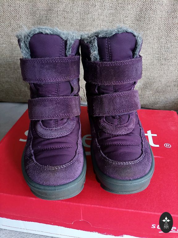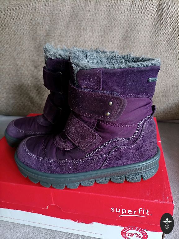 Superfit žieminiai batai 27 dydžio, vidpadžio negalima išimti, bet ~17 cm. Labai geri batai, kelias žiemas pirkome būtent šį modelį. Patogiai užmaunami, viduje vilna, neslystantis padas. Batai dėvėti vieną žiemą, puikios būklės, vienintelis trūkumas matomas paskutinėje nuotraukoje.
