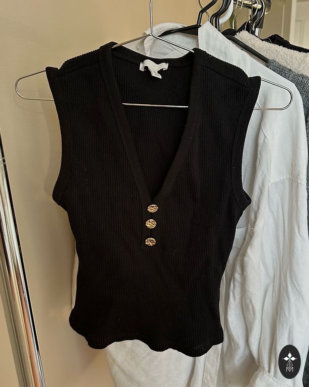 Labai stilingas y2k stiliaus viršus, pirktas Stokholmo vintage parduotuvėje. Viduryje yra 2 tokios siūlės, kurios sukuria šiek tiek korseto įspūdį, iš esmės, jis tiesiog labai gražiai priglunda prie kūno. Audinys tamprus. Ir šviesoje jis šiek tiek blizga. Mielai dėvėčiau šį viršų, bet jis geriau tiktų alyvuogių spalvos odos tonui.