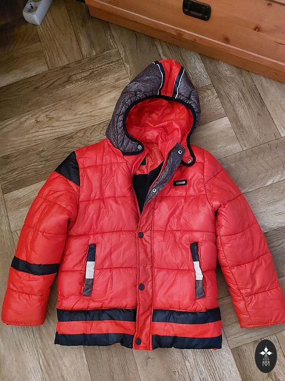 Polo šiltas striukė 92 dydžio, 50% pūkų. Gili kapišonas, gerai apsaugo nuo vėjo. Dovana 98 dydžio (vilkėta nuo 92) Mickey Mouse rudens striukė.